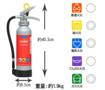 本体高さ:約40cm 外径:約8.5cm 重量:約1.9kg 商品名ABC消火器 PAN-4A 薬剤質量1.2kg 総質量約1.9kg 圧力ガス(ボンベ記号)CO2 17g(B17) 高さ約403mm 外径85mm ホース長さ285mm 放射距離3〜5m(20℃) 放射時間約14秒(20℃) 使用温度範囲−20℃〜+40℃ 能力単位A-1,B-3,C 型式番号消第23〜157号 製造者日本ドライケミカル株式会社 ※1〜2営業日後の発送となります。