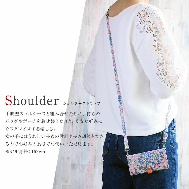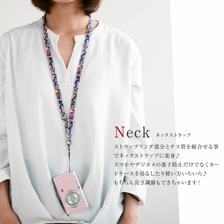 ストラップ部分はリバティファブリックを使用、留のナス管は当店で販売している 手帳型本革スマートフォンケースにぴったり合うオシャレなものを使用していて、 ともに日本製です。