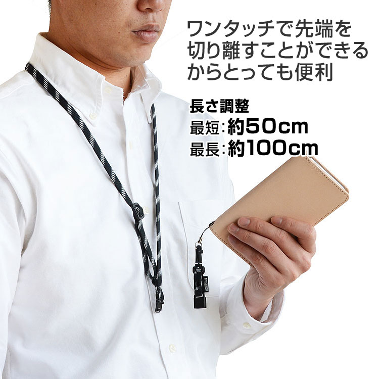 ワンタッチでスマホ本体と切り離すことができるのでとっても便利!!! また、ストラップひも(根付)もついていますので、名札やIDカードは勿論、スマートフォンや携帯の落下防止だけでなく、様々なシーンで用途に合わせて活躍してくれます。